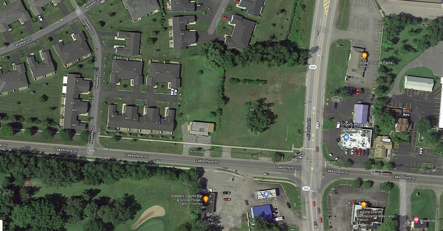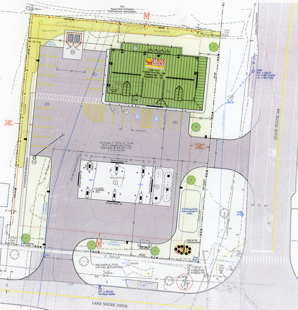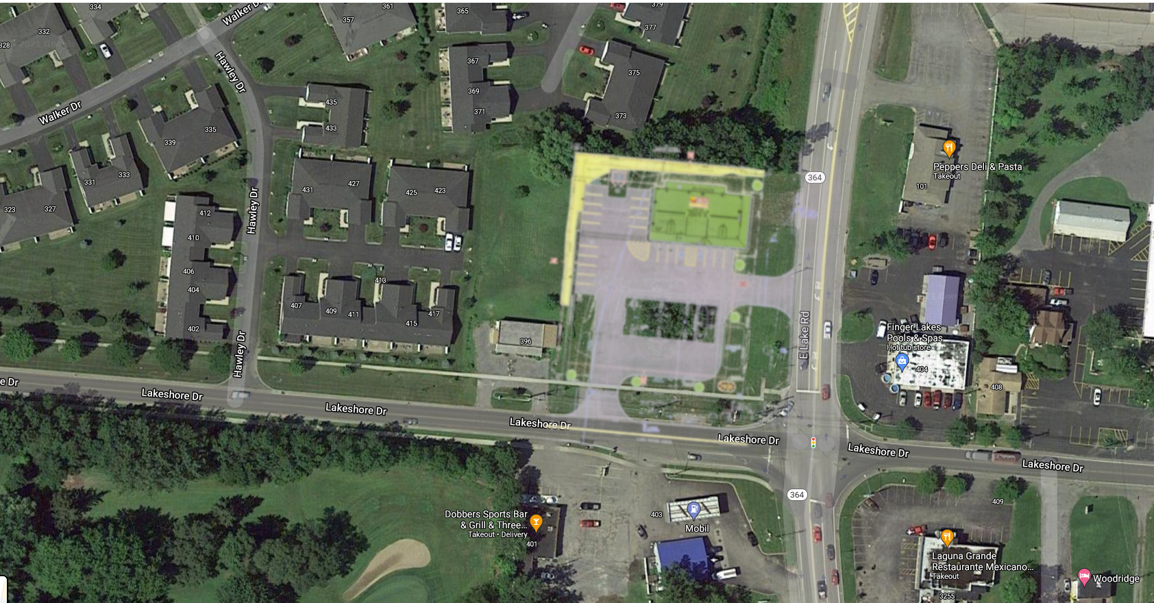 Google Maps aerial view of existing lot 400 at the corner of Lakeshore Drive and Rt. 364.Detail of drawing submitted with variance application.Overlay of the above two images.Zoning Variance Hearing Notice